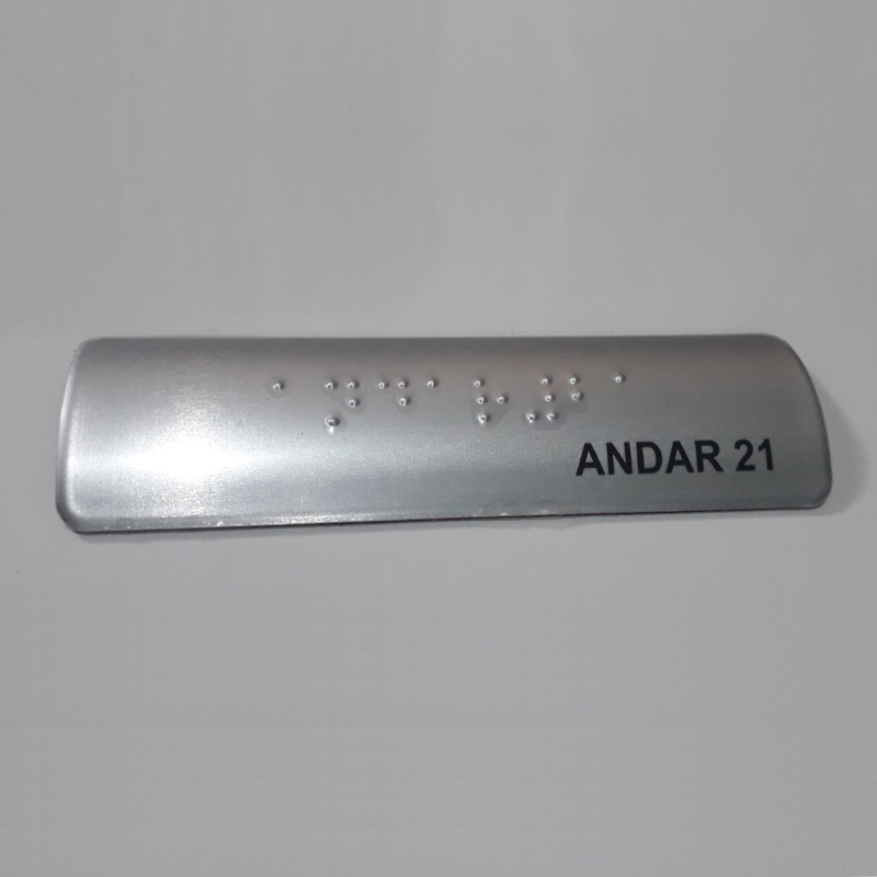 Sinalização braille em alumínio 10×3, com dupla face, aplicada no início e fim dos corrimões.