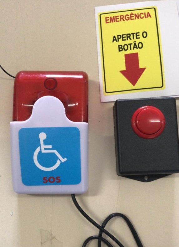 Alarme de emergência para sanitários. Deve ser instalado dispositivo de alarme de emergência próximo à bacia, no boxe do chuveiro e na banheira, para acionamento por uma pessoa sentada ou em caso de queda nos sanitários, banheiros e vestiários acessíveis. Recomenda-se a instalação de dispositivos adicionais em posições estratégicas, como lavatórios, portas, entre outros. A altura de instalação da botoeira deve ser de 40cm do piso.