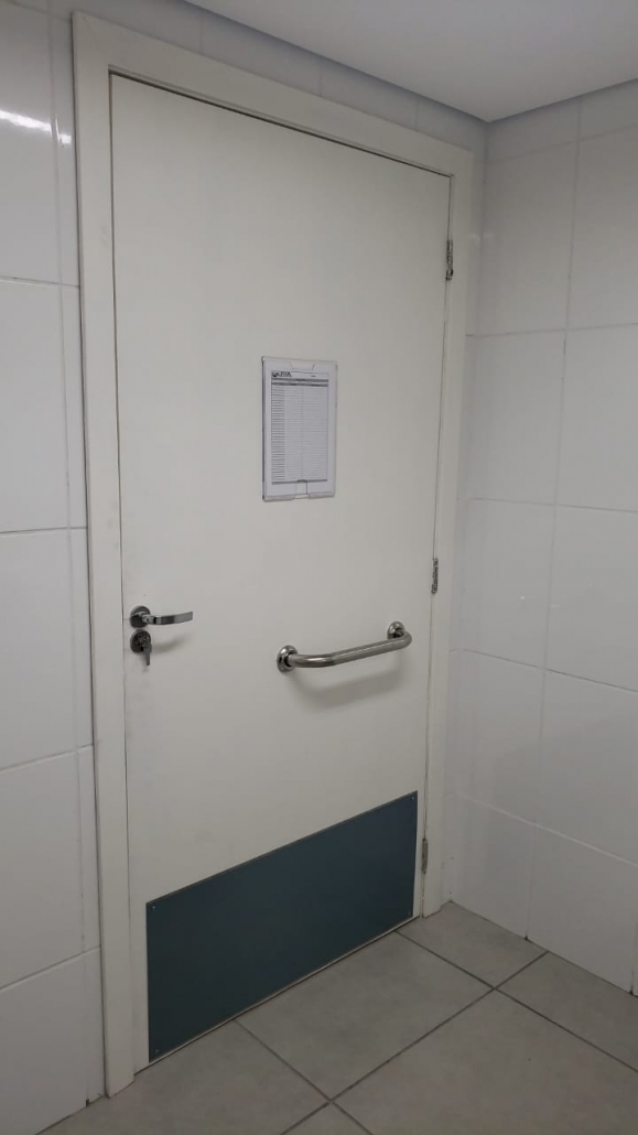 Revestimento para portas em chapa de aço inox resistente a impactos, altura 400mm, largura podendo ser de 800mm, 820mm, 900mm, 920mm ou 1000mm.