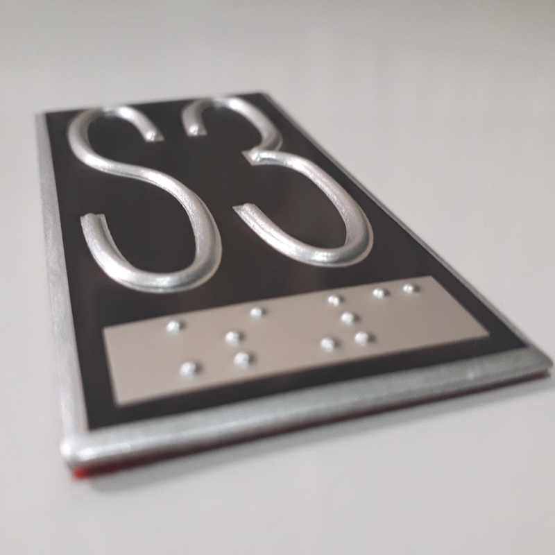 Placa batente elevadores em alumínio, numeração e braille em alto-relevo, aplicada próximo a botoeira dos elevadores.
